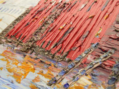Umgang mit Struktur-Pasten und Colour-Shaper Wir legen eine Farbfläche mit Ultramarine Blue an, lassen diese leicht trocknen und geben Clear Tar Gel über die Fläche. Jetzt nehmen wir den dünnen Pinsel und ziehen Linien mit Iridescent Pearl Coarse hinein. Jetzt arbeiten wir mit der Light Molding Paste und geben einen Farbtupfer nach Wahl hinzu. Zuerst modellieren wir mit Pinsel, dann mit Colour-Shaper. |